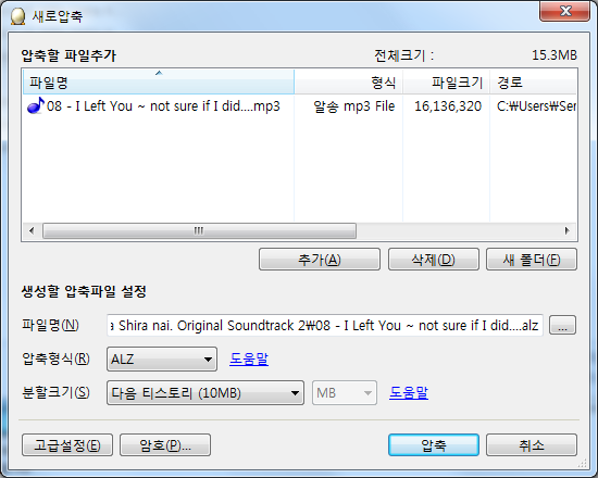 그리고 "압축" 버튼을 누르면 9.99MB에서 분할되기 때문에 10MB 제한인 티스토리에서 업로드가 가능하게됩니다.